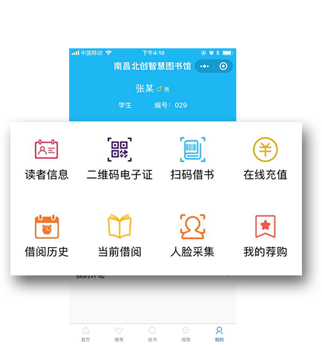手機掃碼借書還書、人臉采集、讀者自助薦讀圖書、在線充值、查閱借閱歷史等多種自助功能。